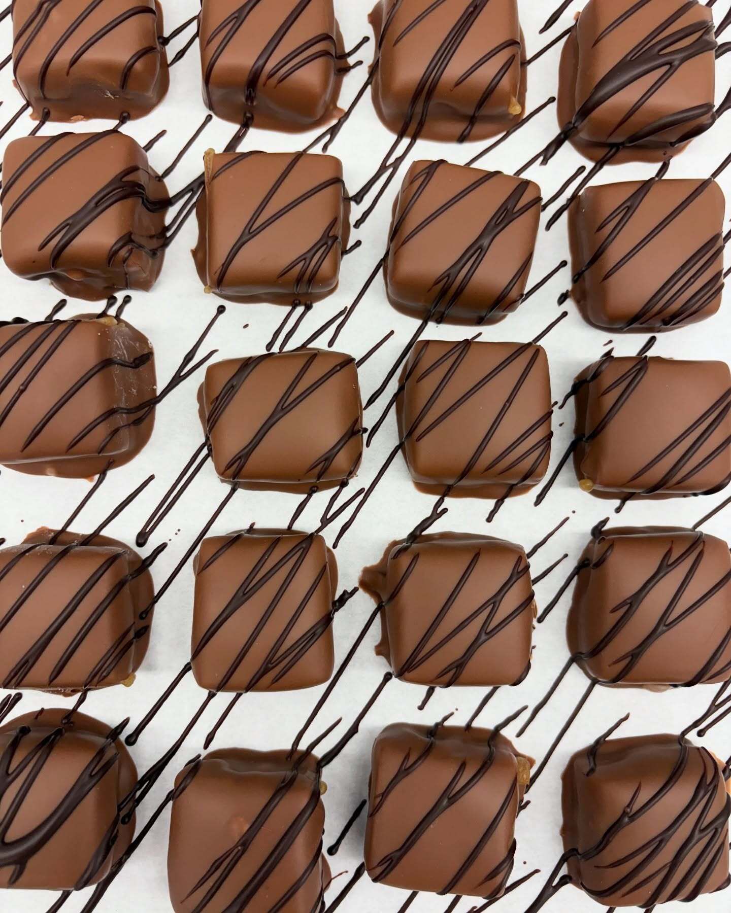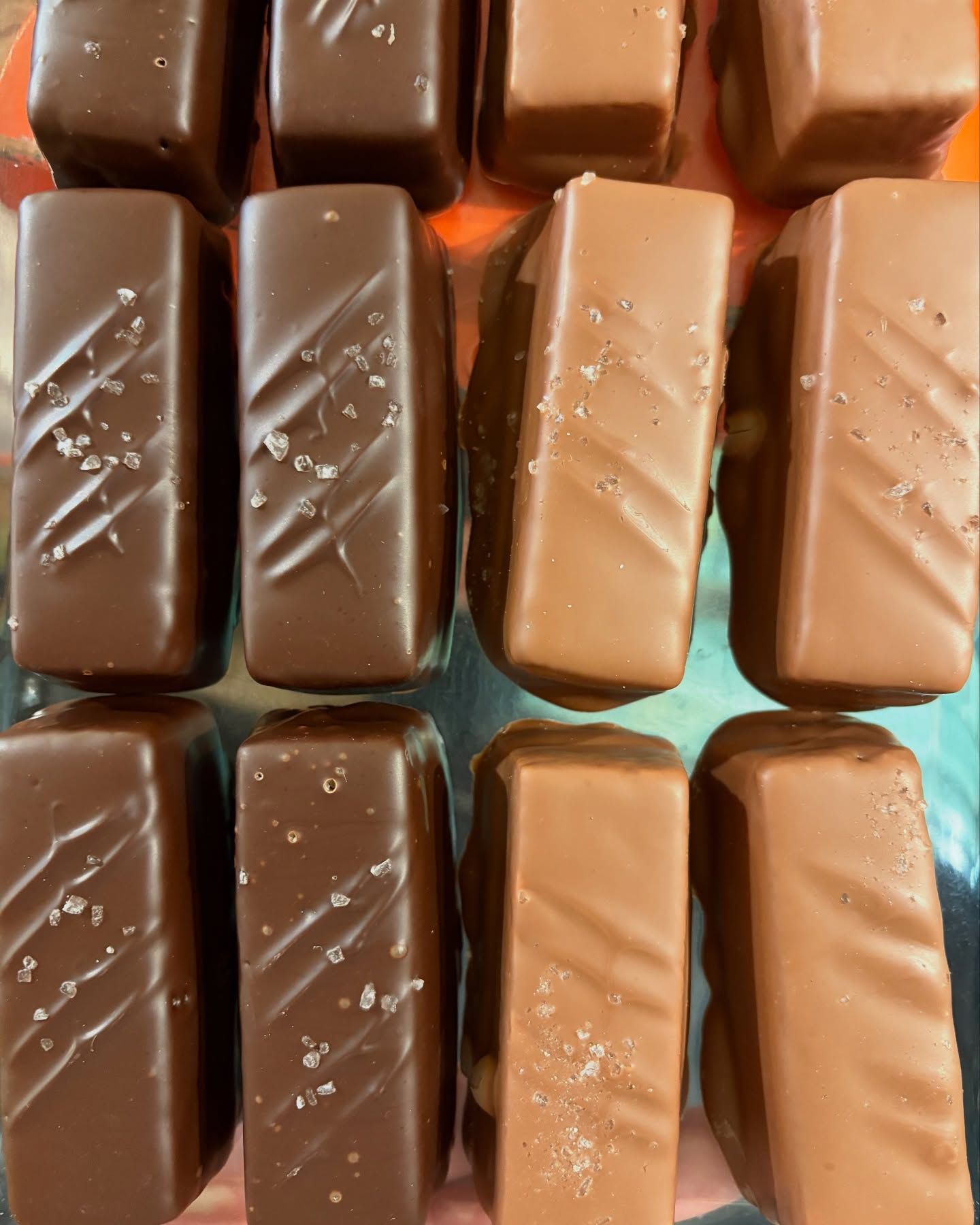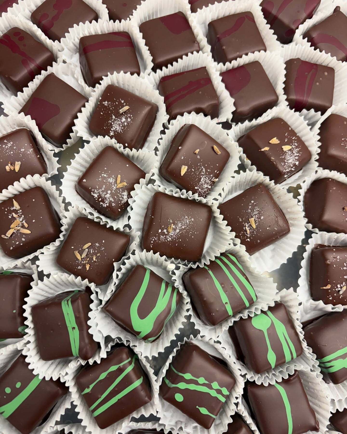 Our Salted Caramel and Pecan Turtles are always the biggest sellers. Some of our more fun ones are our vegan options, the Passionfruit Caramel, and Tahini. Currently, I am working on Key Lime Puppy Chow. I’m also bringing back the Frosty and Fry, which replicates that feeling of dipping a fry into a chocolate milkshake.