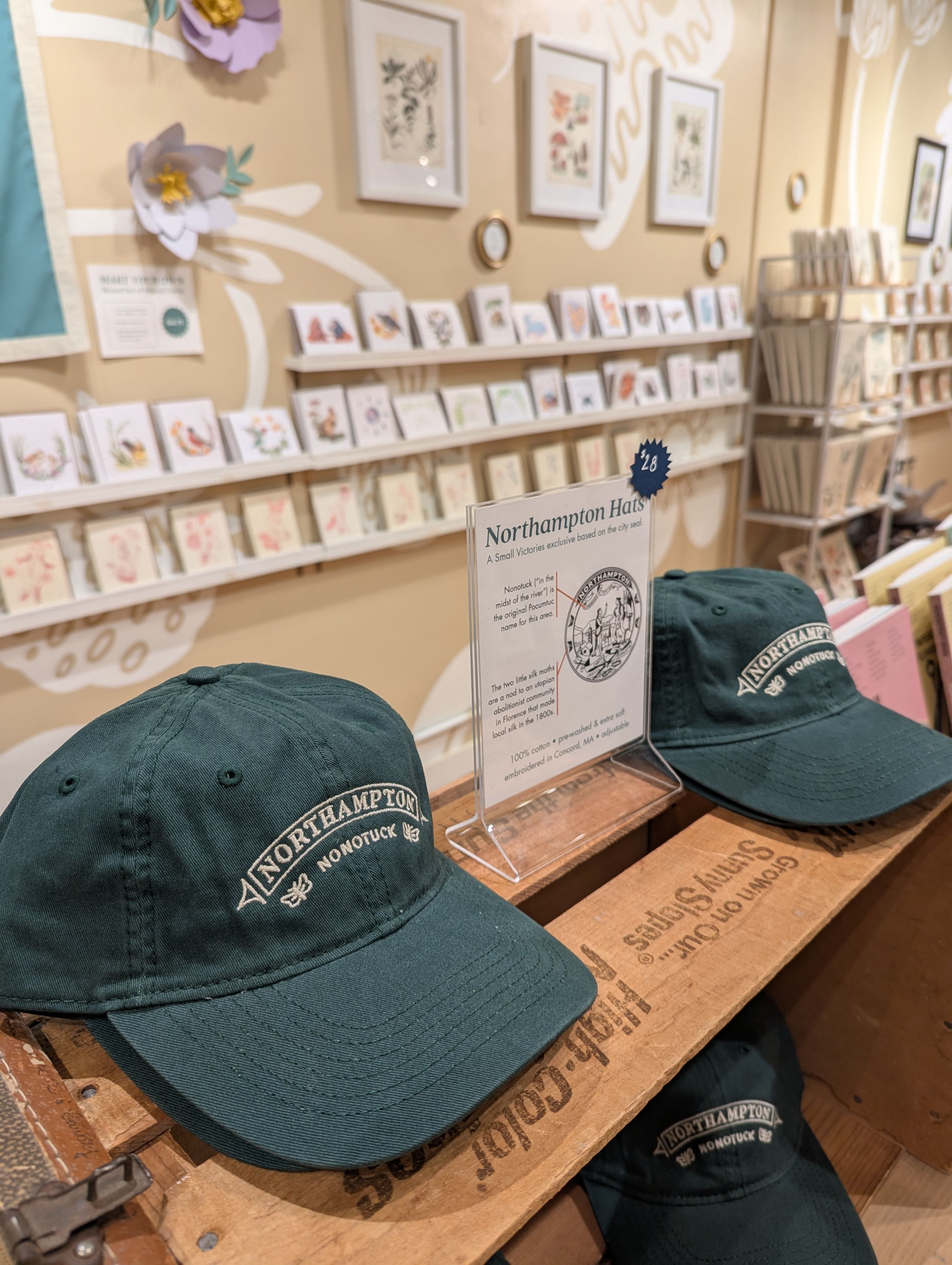 Another recent addition is a baseball-style hat that says Northampton and features the official city seal, which includes silk moths to represent the silk industry and Nonotuck, the indigenous name for the area. It’s already been selling well, and people seem excited about it. It’s nice to have some kind of Northampton-related merch, as there isn’t much in the area currently. We wanted something that would appeal to both visitors/tourists and residents alike. We’re also working on a series of Zodiac cat cards with catnip seeds, which we think will make fun birthday/occasion cards.